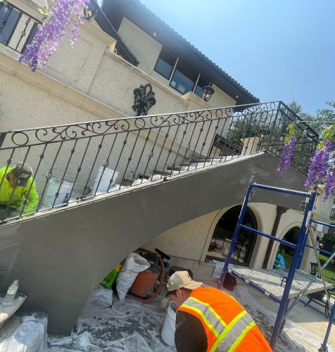 The project included an exterior stair reconstruction, custom stucco finish to match existing, driveway entry pier repairs, and coating restoration